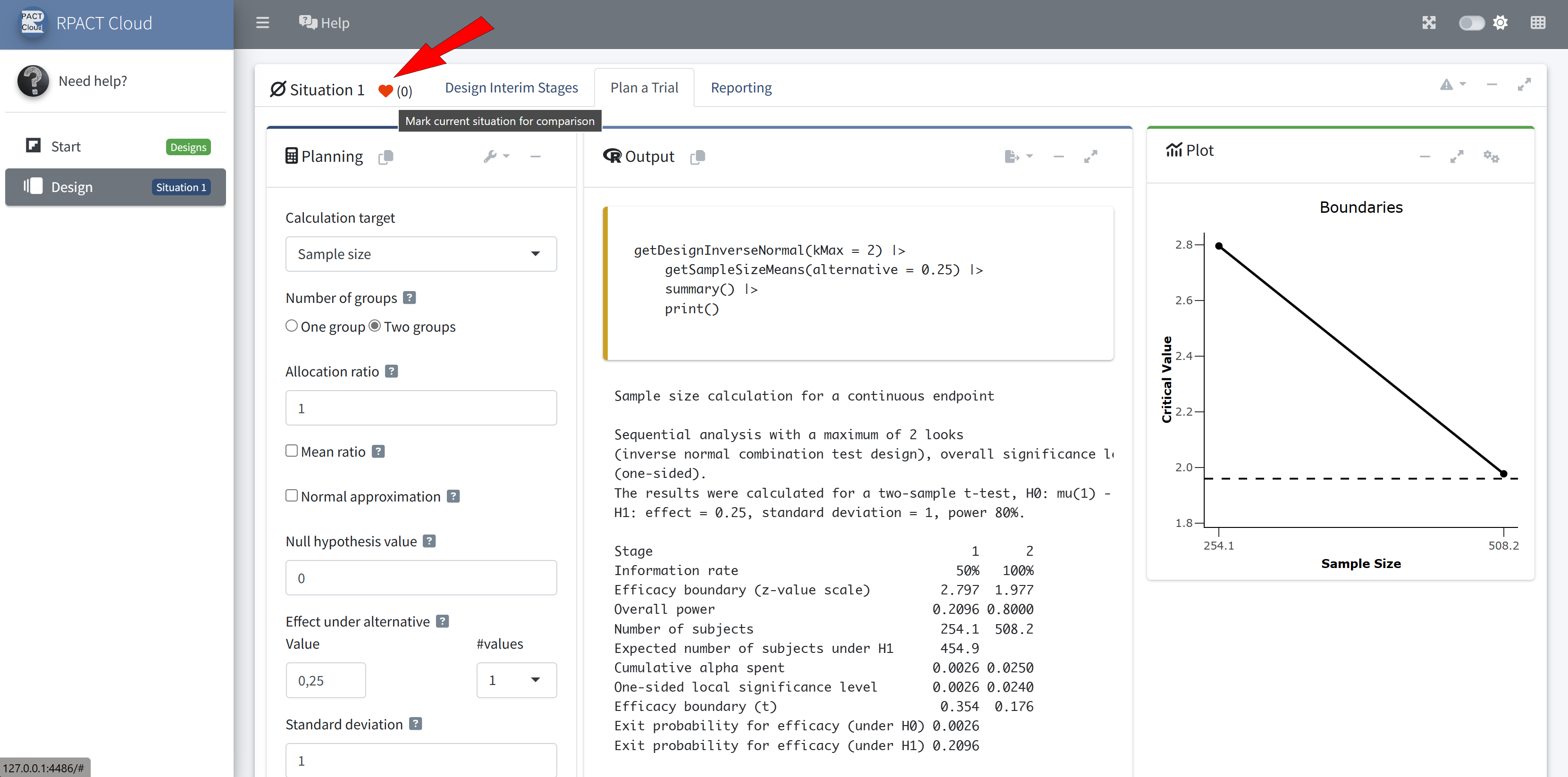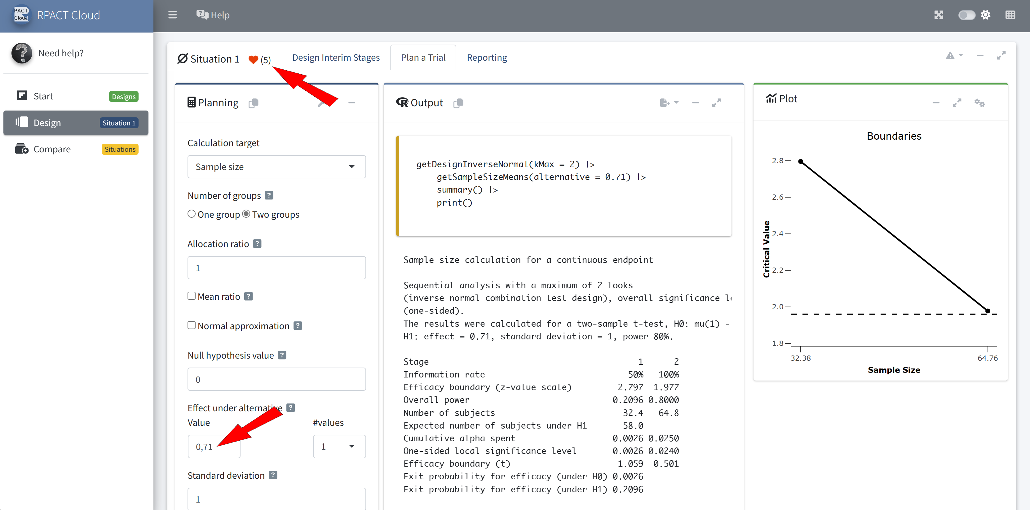 Sequential analysis with a maximum of 3 looks (group sequential design), one-sided overall significance level 2.5%, power 80%. The results were calculated for a two-sample t-test, H0: mu(1) - mu(2) = 0, H1: effect = 2, standard deviation = 5.